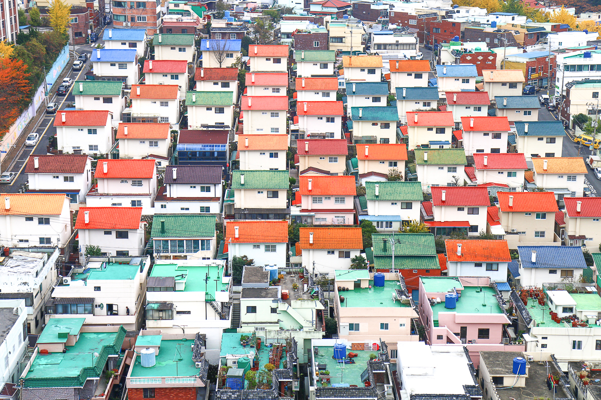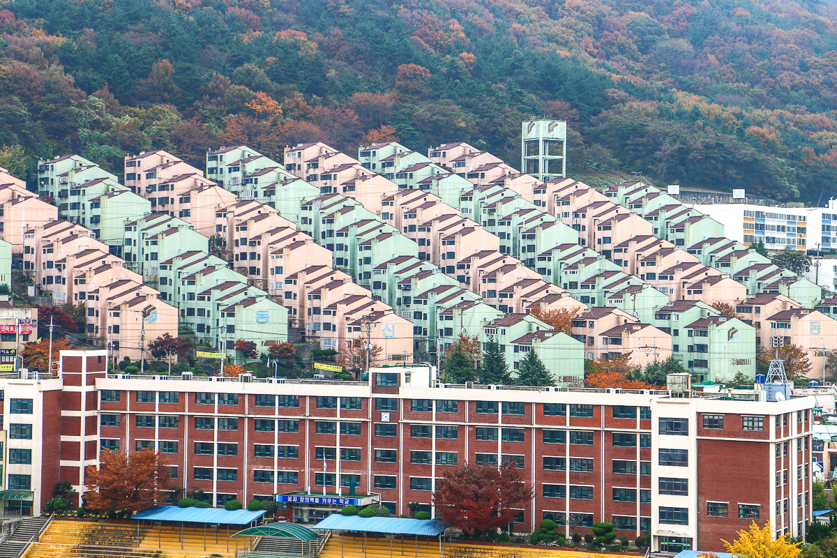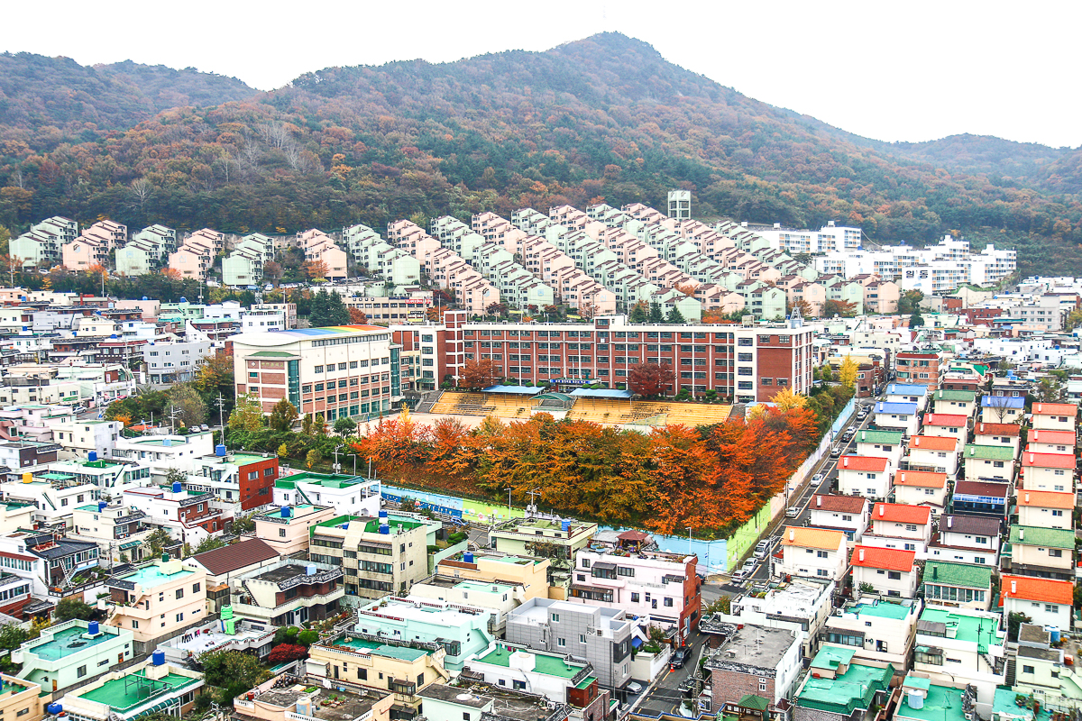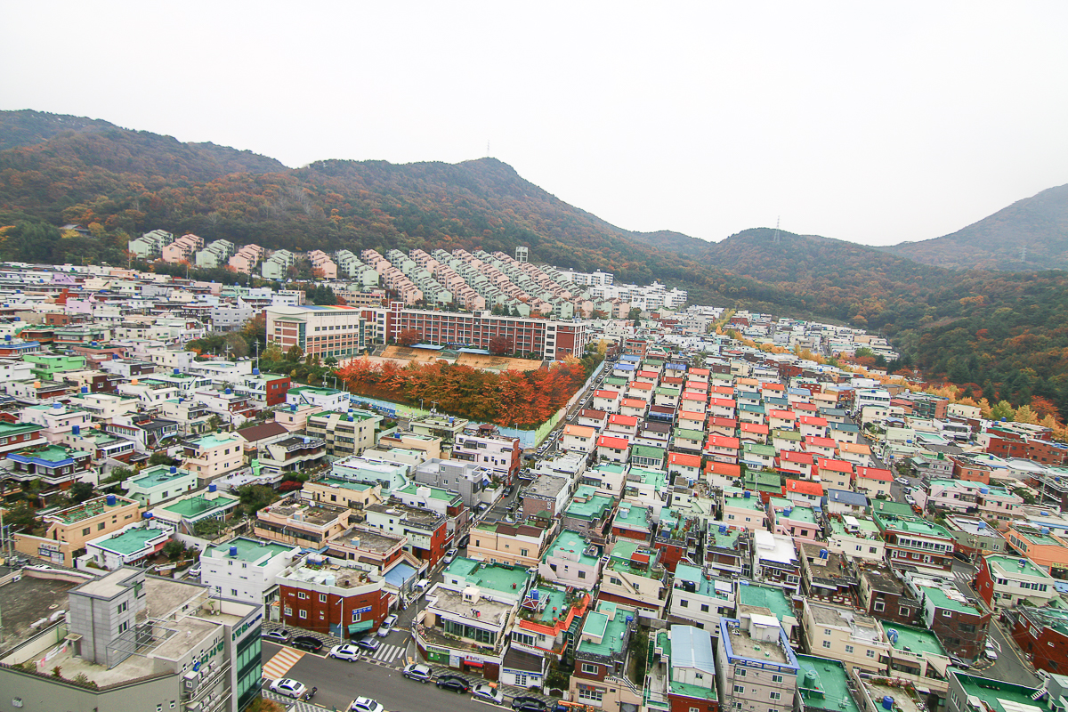 부산 만덕동 레고마을 알록달록 외형이 모두 같고 지붕의 색깔만 다르다... 실제로 보면 아주 귀엽습니다. 지도로 보니 백양중학교. 강당으로 보이는 건물 지붕도 알록달록하고 벽도 예쁘다. 중학교 뒤로 보이는 동신 아파트... 모양도 특이하고 빛바랜 느낌도 괜찮다. 유림아파트에서 이곳 사진을 찍을 때 재미있었던 일이라면... 내 키보다 높은 곳 창문만 열려있어서 까치발하고 카메라 렌즈만 밖으로 내놓고 사진을 찍는 일이었는데 가장 높은 층에는 이미 다른 사람들이 사진을 찍고 있었고 나는 그 밑에 층, 다음에 온 사람은 내 밑에 층... 고요한 아파트 계단에서 사진 찍는 소리만 들린다는 거. 아파트 다른 라인에서도 이런 일이 벌어지고 있을 걸 생각하니 혼자 그냥 막 웃겼다. 주변의 고층 아파트들까지도 색깔을 맞추어준 것 같은 느낌이다. 레고마을을 한 번 더 보고나서 아파트를 내려왔다. 들리는 말에 의하면 감천문화마을이나 통영 동피랑처럼 부산 가볼만한곳 문화마을이나 벽화마을로 조성하려고 하였는데 실패했다는... 내가 보기에도 골목의 경사가 너무 심하고 도로도 좁아서 관광객이 찾기에는 적당한 위치가 아닌 것 같아 보이기도 했다.