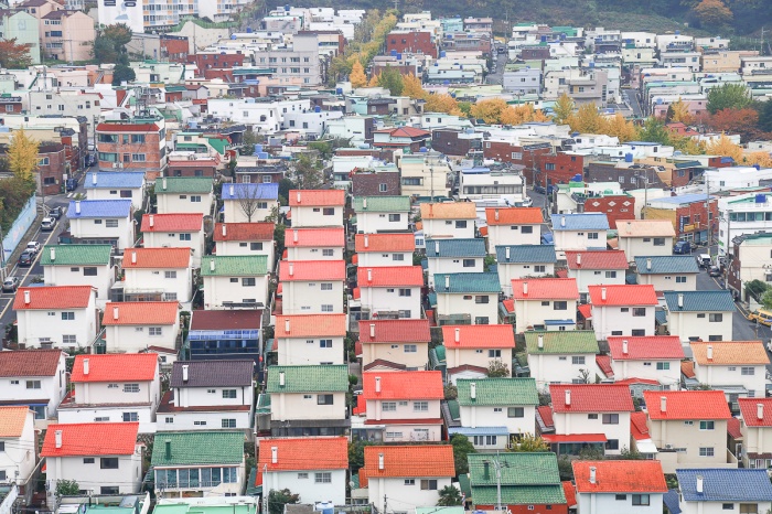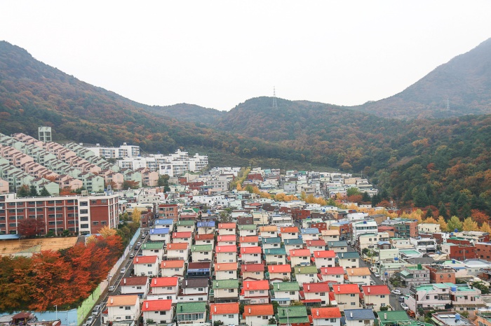 마을의 사진을 보는 순간 너무 예뻐서 꼭 한 번은 와보고 싶던 곳이었다. 옹기종기 참 예쁘기도 하다. 사람들이 놀기에는 감천문화마을이 더 좋지만 그냥 풍경만 보자면 이곳도 그에 뒤지지 않는 듯싶다. 레고마을의 전경. 곡예타듯 아슬아슬한 곳에서 사진을 찍었더니 카메라 무게 때문에 팔이 떨어져나갈 뻔 했다. 이곳을 찾는 사람들이 모르는 레고마을의 진짜 아름다움은 은행나무길에 있었다. 사진만 찍고 가지 말고 마을길도 한 번 걸어보고 싶어서 오르막을 한참이나 걸어왔더니 샛노란 길이 가슴 떨리게 한다.