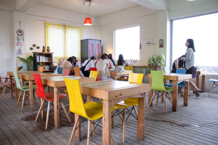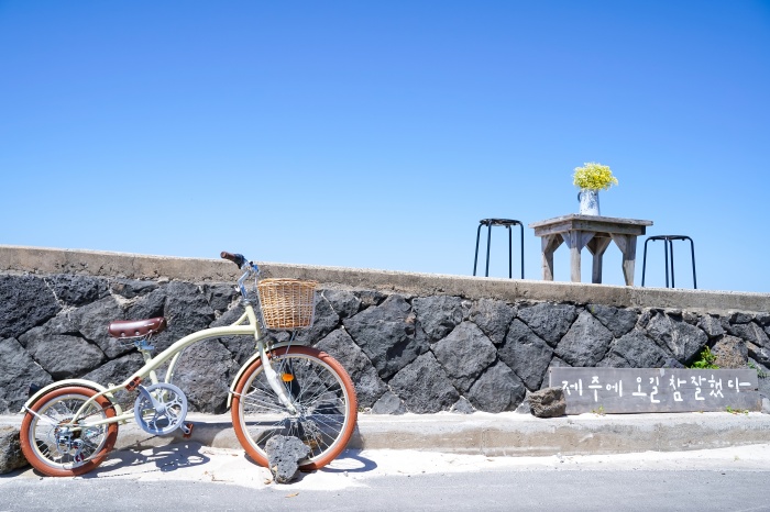일행들은 나의 강요에 의해 한라봉 에이드, 제주동백꽃아이스차, 세화씨 에이드를 주문했다. 괜찮아, 내가 결제했으니까. 음료 주문해놓고 구석구석 구경하기. 왜 그렇게 유명해졌는지 알 것 같았다. 카페 내부가 참 예쁘기도 했다. 내 집도 이렇게 카페 분위기 났으면 좋겠다는 생각, 제주 여행을 하면서 몇 번이나 하게 된다. 아 분위기 끝장. 해롱해롱이다. 날씨가 좋아서 파란 하늘이었고, 그 유명한 코발트블루가 있었다면 아마 창밖 풍경을 보다가 쓰러졌을지도 모른다. 흐린 날이었음에도 정말 예뻤던 세화해변이다. 음료가 나오나 안 나오나 관심도 없고 모두들 구경하느라 내가 누구랑 왔나? 그딴 건 신경도 못쓸 정도였다. 갈매기 모빌도 좋았다. 그러다가 또 해변 바라봐준다. 앞에는 사진 찍을만한 장소가 많아서 제주도 여자 여행객이나 커플들이 많이 찾는 장소이고, 테이블 외에도 자전거 소품도 있어서 무궁무진한 인생샷을 건질 수 있는 장소였다. 그러다가 또 카페 내부 구경한다. 눈이 뒤통수에도 달려있었다면 내가 이 정도로 정신이 없지는 않았을거다.
