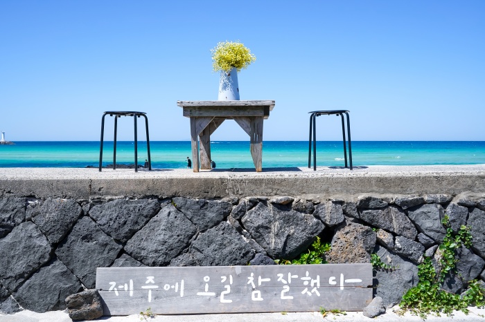 정말 아름다우니까. 음료가 나오자마자 난 세화해변으로 향했다. 일행이 카페 안에서 잠깐의 휴식을 취한다고 할 때 난 그 시간이 아까워서 죽는 줄. 현무암이 넓게 깔린 세화해변 사진으로 보는 것보다 훨씬 예쁘다. 어떤 장소들은 사진으로 보고 반해서 막상 여행을 가보면 실망하는 경우도 있었지만 사진보다 실제가 훨씬 아름다운 곳이다. 테이블 앞에서 한라봉 에이드와. 여자들이 꼭 하는 것. 누가 뭐라고 해도 그 순간에는 그냥 다 좋았으니까. 제주도에 사는 이웃님이 얼마 전에 사진을 올렸던데 날씨 좋은 날 다녀오셔서 그런지 코발트빛이 그대로 다 담겨서 엄청 부러웠다.