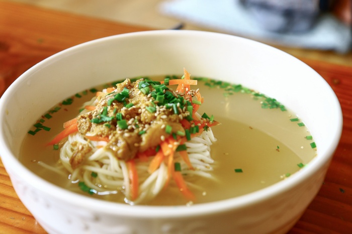 고기 국수의 맛은 괜찮겠지. 일단 비주얼에서 실망. 왜 방송에서 보면 국수 위에 고기가 수육처럼 가지런하게 올려져 있던데 이건 막 썰어놓은 고기를, 막 올려놓은 것 같은 정성 없어 보이는 비주얼. 고기는 4~5점 정도. 뭔가 부족해 보인다. 고기가 엄청나게 맛있거나, 국물을 떠먹는 순간 맛에 빠져 눈이 돌아갈지도 몰라. 그렇게 기다려왔던 고기국수인데!!! 걷어내니 그냥 멸치국수 같아 보인다. 담양 국수거리에서 멸치국수를 먹다가 벌레가 나왔지만 사실 그곳의 맛은 끝내줬었다. 면 싫어하는 내가 한 그릇 다 먹었으니까. 아, 완전 실망이다. 어떻게 맛이 이럴 수가 있어. 국수에서 밀가루 냄새가 심하게 난다. 성게 국수는 면에서도 비린내가 올라온다. 우리가 잘못 선택한 건지, 아니면 고기국수의 맛이 원래 이런 건지. 담양 국수거리가 100배는 더 맛있다고 자신 있게 말할 수 있다.